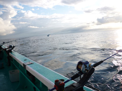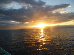 9月30日 前回最後と云いながら、又行って来た!!立って釣ることが厳しい事は承知しているが、ノドクロならば座っていても何とかなるだろう・・・と甘~~い考えで。ブロック注射は全く効かず、又、その後投薬を3週間、漸く10月30日に手術日が決まった。今回は大きな手術になり、痛みも残るかもと医者に言われた。(しかし、方法は未だ確定していない様なのだ(^^;; 故に最悪下半身不随・・ということも無きにしもあらずとの思いも有り、家族の反対も有ったが本当にこれが人生最後の釣り・・になるやしれぬ、そしてノドクロに今年はNさんを一度も誘っていなかったので今回は同行となった。前日は曇り空にときたま霧雨状態だったが、ここに来て気候も漸く秋らしくなってきて、前夜は久しぶりに寝袋使用だった。 今日は綺麗な日の出だ。 周りにはこの一隻だけだ。 7時頃にはベタ凪に、未だ船中当りがない。