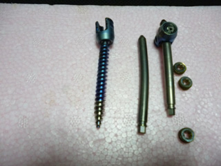 抜けないと言われていた折れたボルトは、抜くことが出来、今度はもっと太いものを入れたと DRから説明が有り、取り出したチタンのボルトと支柱?をくれたので貰って来た。前のボルトは5ミリ径で6cmだったが、今度はもっと太い物を入れ、骨盤には9㎝長のボルトが入っているとの事だ。